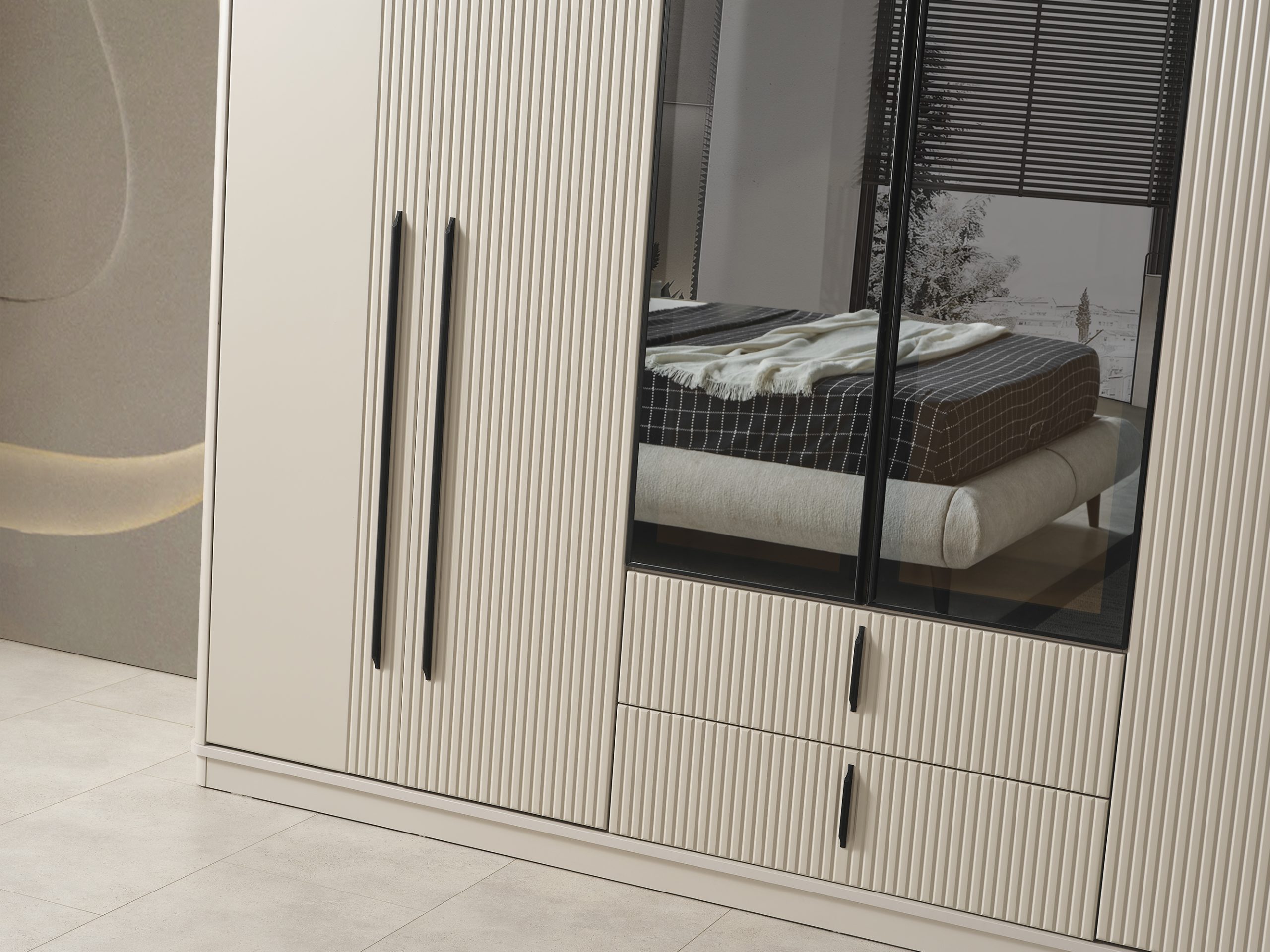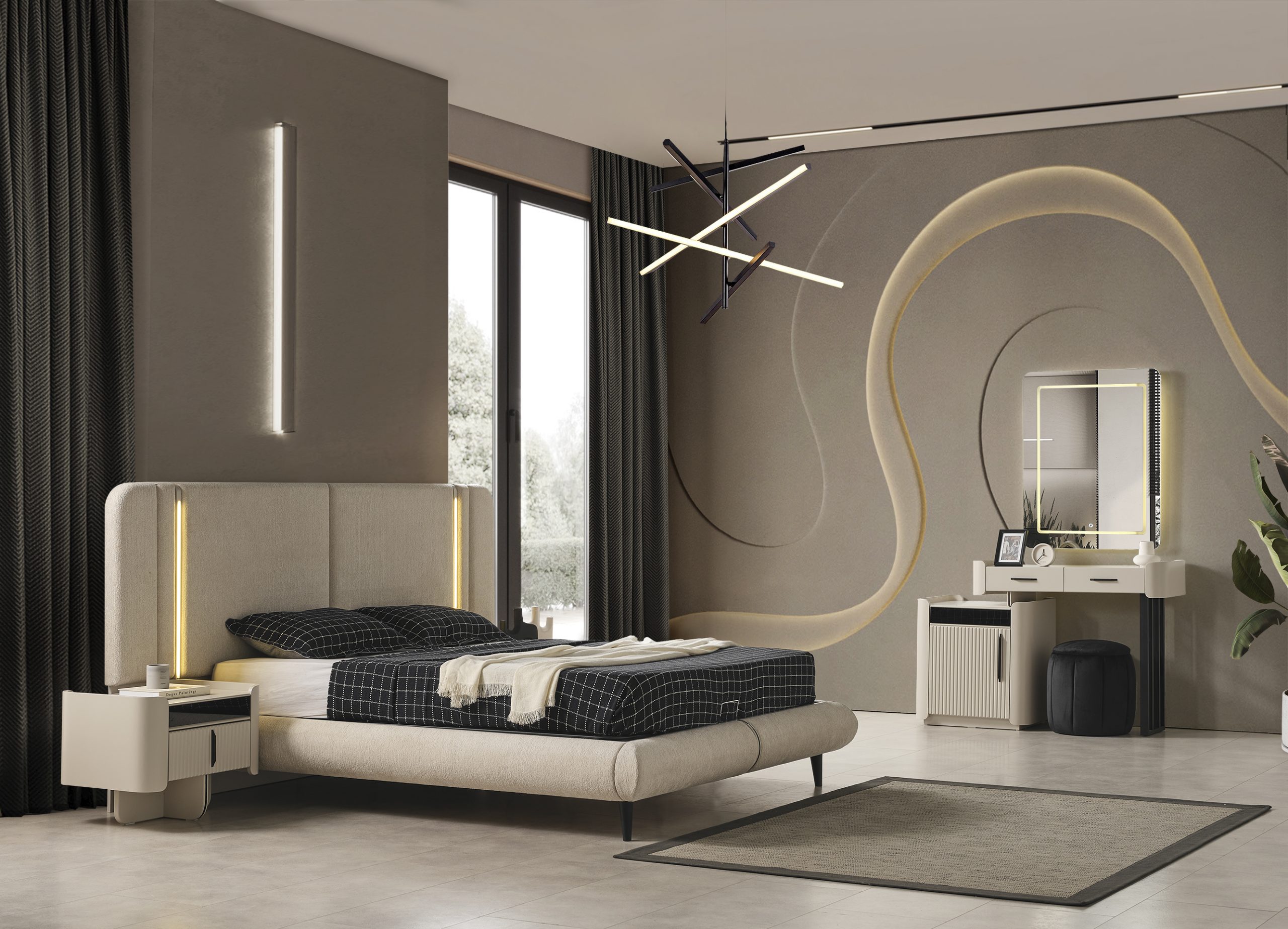 Dolap, Karyola, Karyola Başucu, Şifonyer ve Aynası, 2 Adet Komodin (Takım içeriğini bazalı karyola olarak değiştirebilirsiniz.)